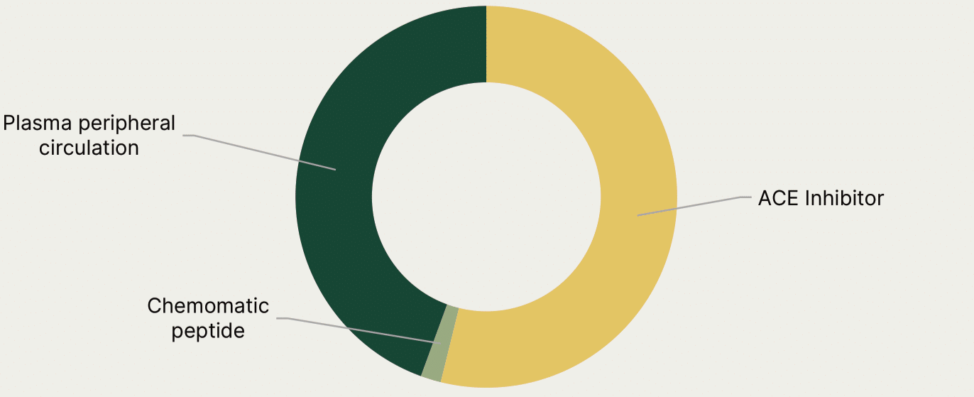 As we can see in the chart, the study demonstrates the positive effect on the ACE inhibitor, chemomatic peptide, and plasma peripheral circulation. Simultaneously, the chemomatic connective tissue regeneration and the plasma peripheral circulation is improved, providing more blood circulation and increasing the availability of collagen to enhance the anti-aging effect.