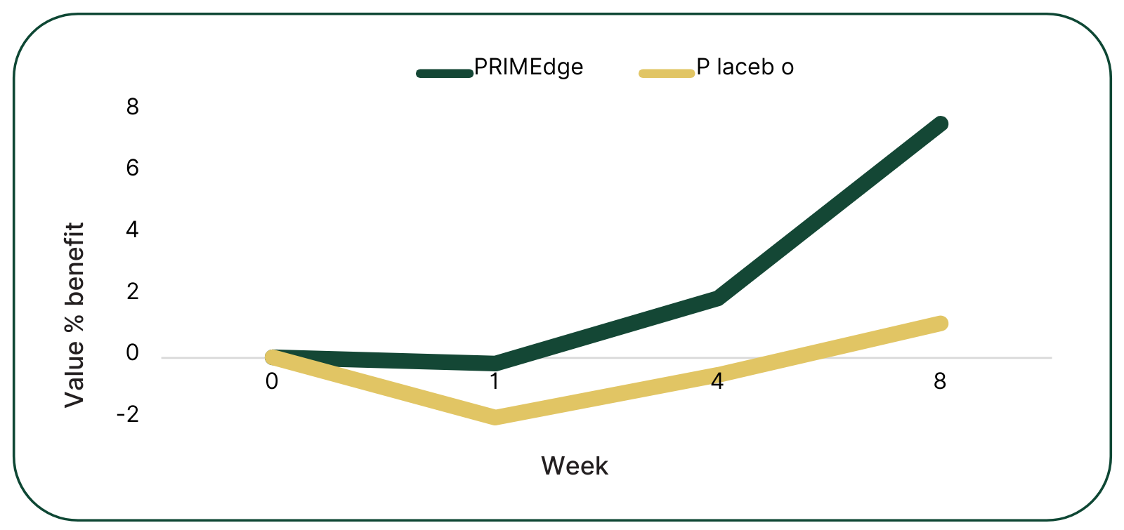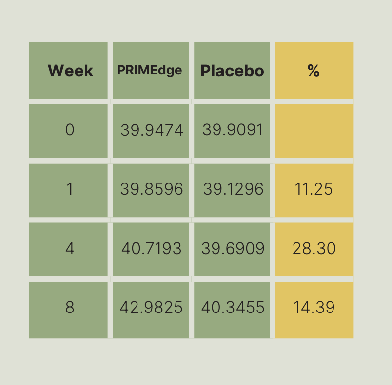 As shown in the graph, the improvement of skin elasticity is statistically significant immediately at the beginning of Primedge collagen peptides intake. When comparing Primedge collagen peptides to the placebo group, the notable difference in efficacy is clearly visible after a short period of 4 weeks. Considering these results, the long term use of Primedge collagen peptides provides a significant benefit to skin elasticity in 10 comparison to the placebo group. 8 provided by Primedge collagen peptides exceeds 15%, compared 4 2 According to the table, the benefit to the placebo. The benefits of a regular Primedge intake start from week 1, while it shows a progressive improvement until the 0 full potential recovery in w0eek 8.